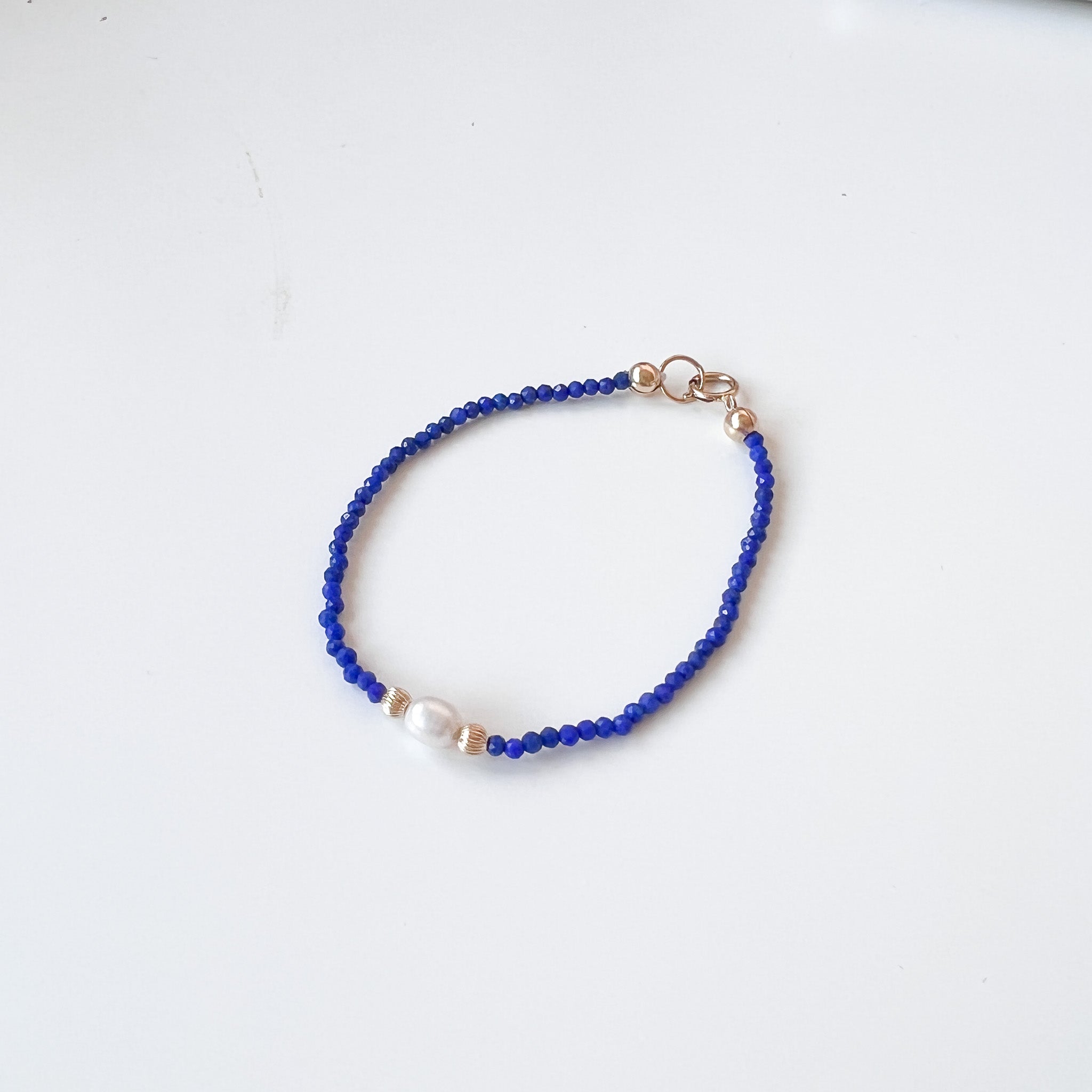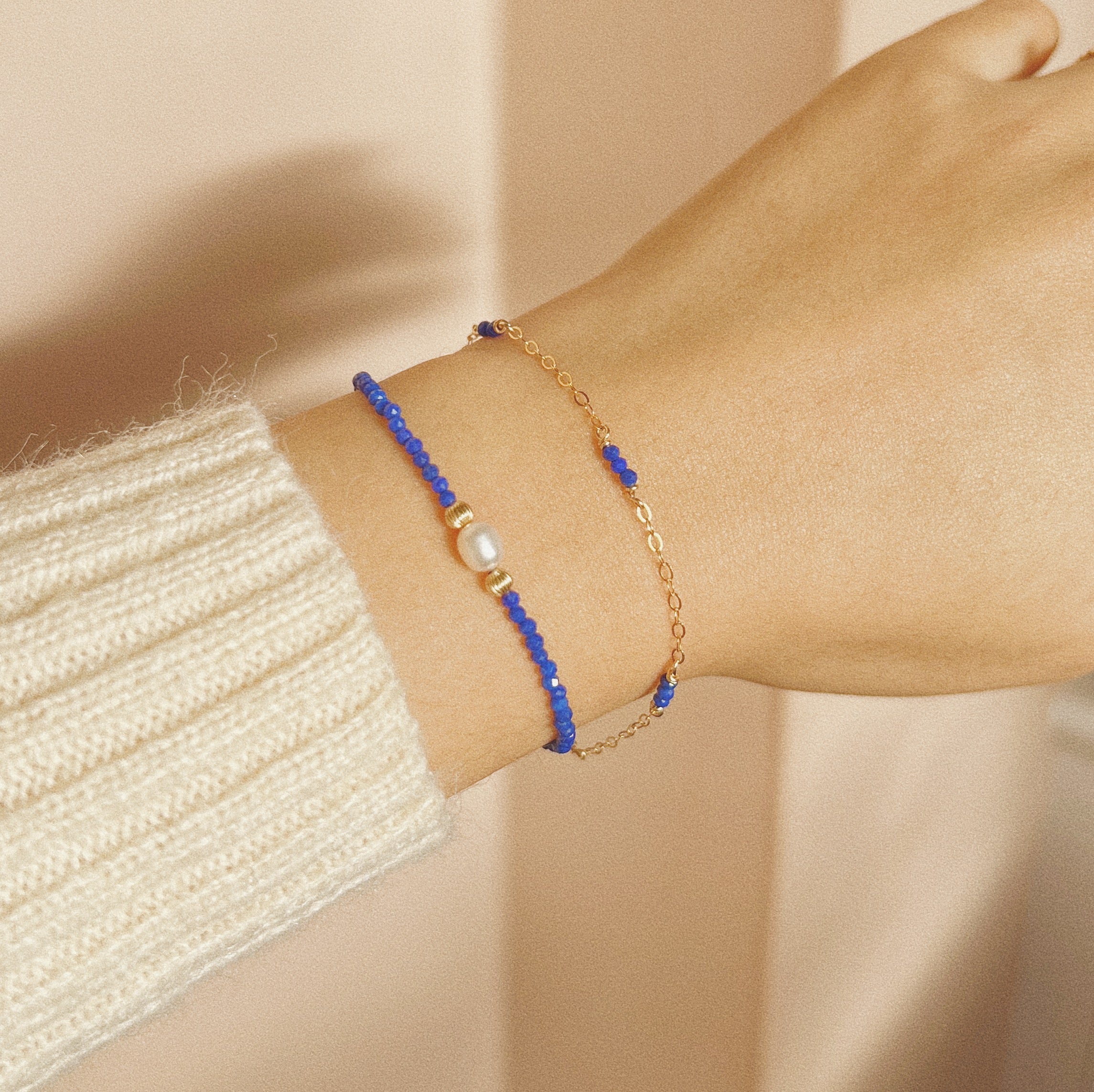The good kind of "blue" comes from the natural glow of the Lapis Lazuli Pearl Bracelet.
