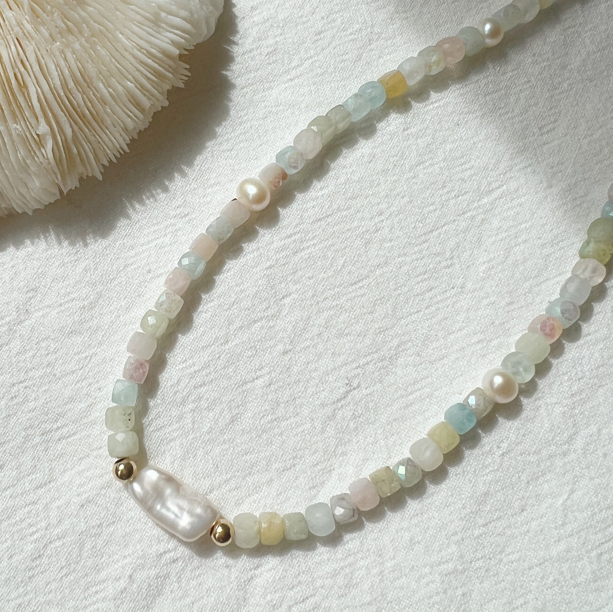 - Size: 4mm square shapes morganite, 4mm round pearls