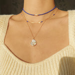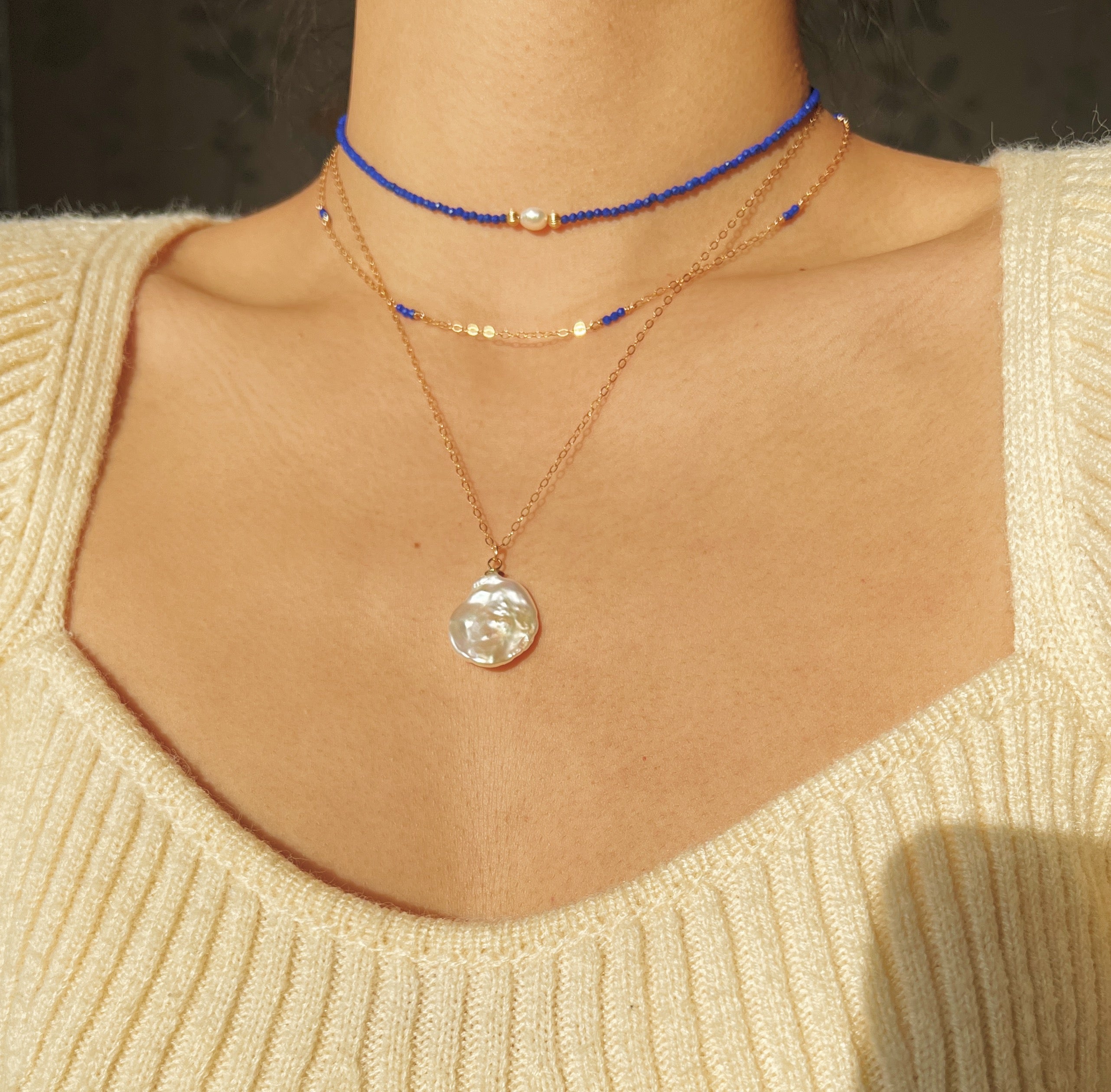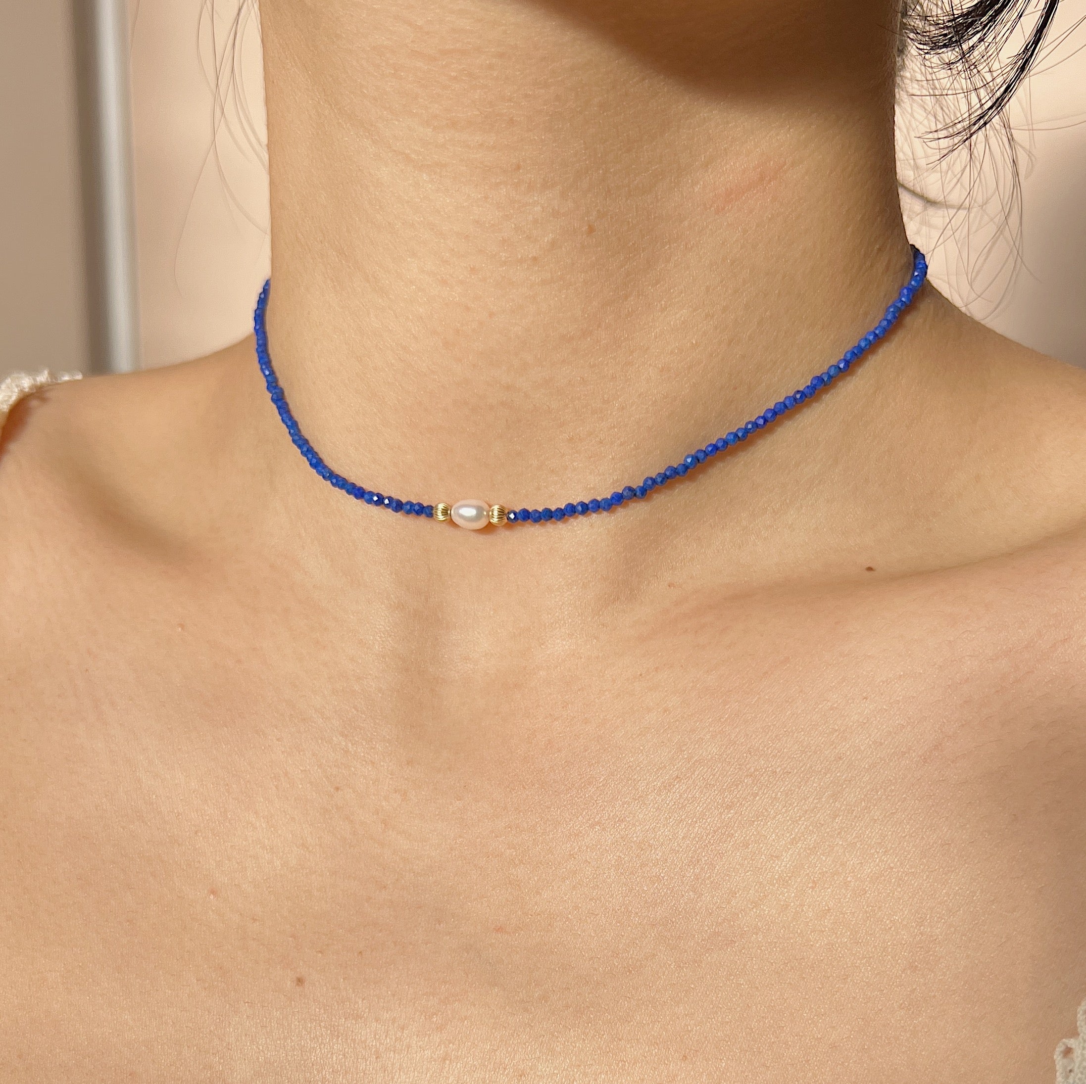 The good kind of "blue" comes from the natural glow of the Lapis Lazuli Pearl Choker. It sits perfectly above your collarbone which makes it a perfect stacker piece.