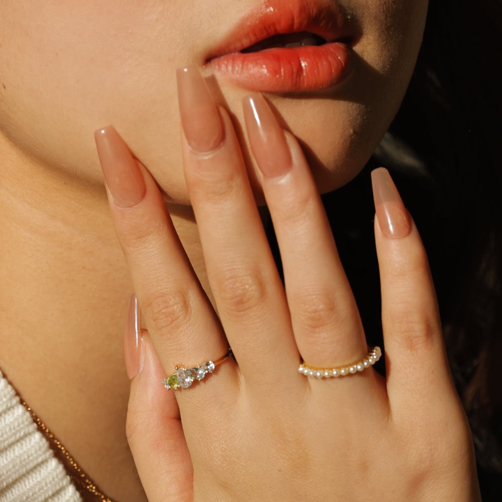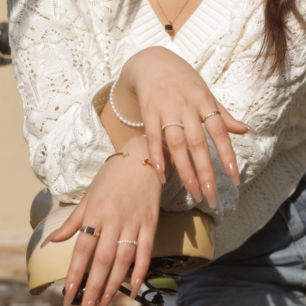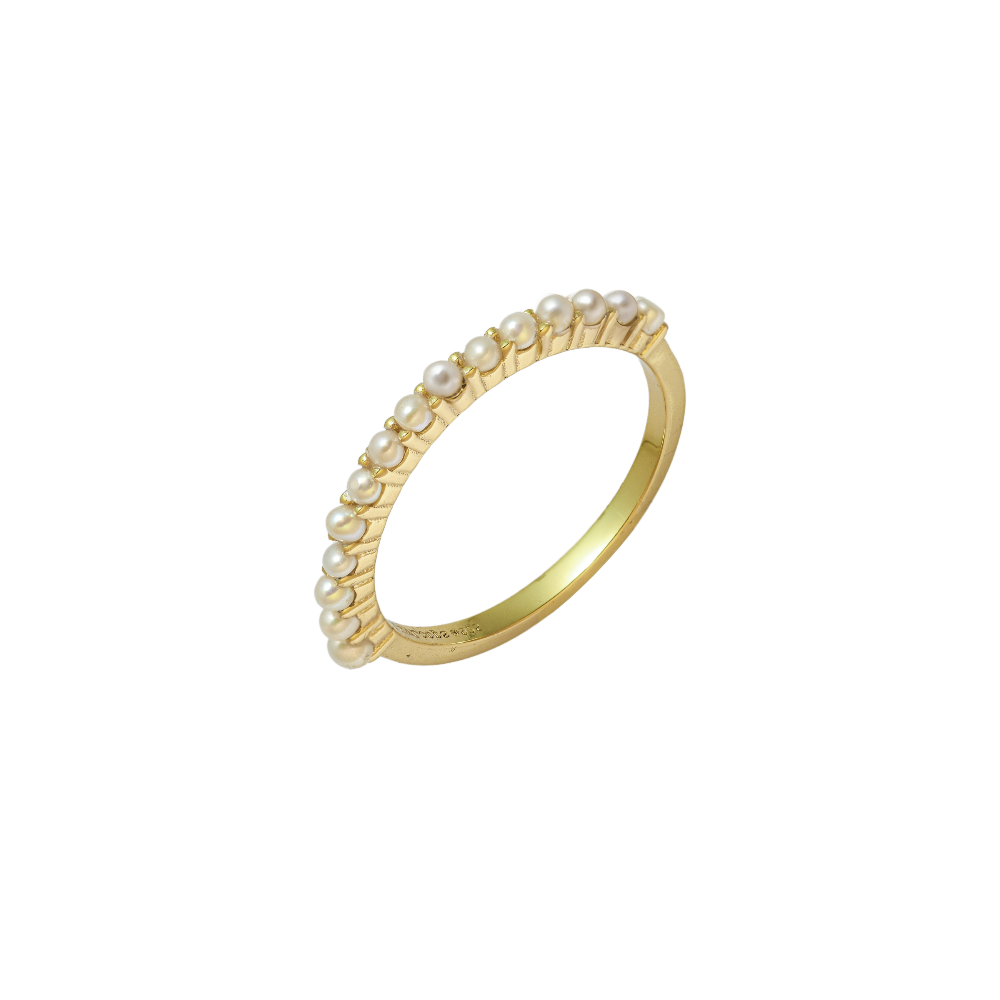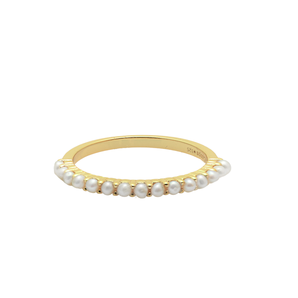 Elevate your style with this half eternity pearl ring – a perfect stackable piece. Delicately crafted, it features a row of lustrous pearls, embodying timeless elegance with a modern touch. Adorn your finger with sophistication and grace.