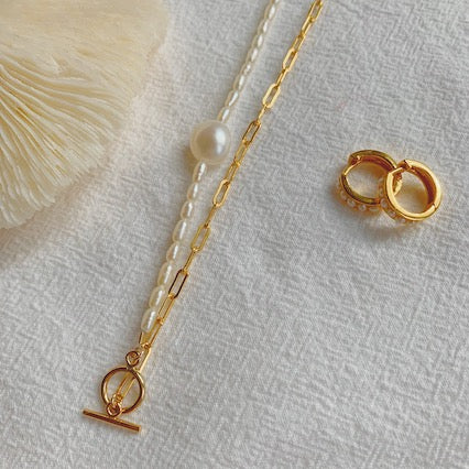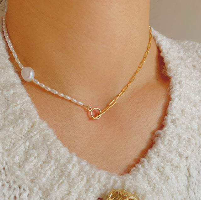 - 14K gold-filled paper clip chain + 2mm freshwater oval pearl & 9mm baroque pearl