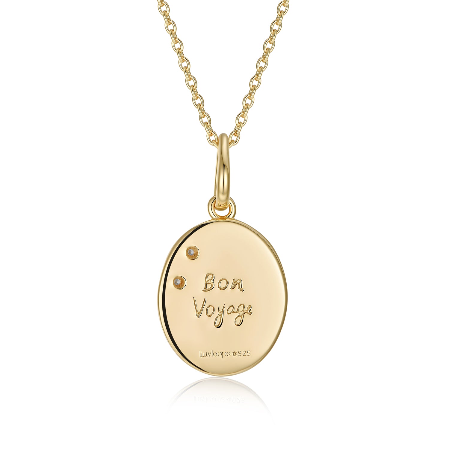 Engraved along the sides of the band are the words “Bon Voyage”, accompanied by delicate olive branches — timeless symbols of peace, hope, and safe passage.