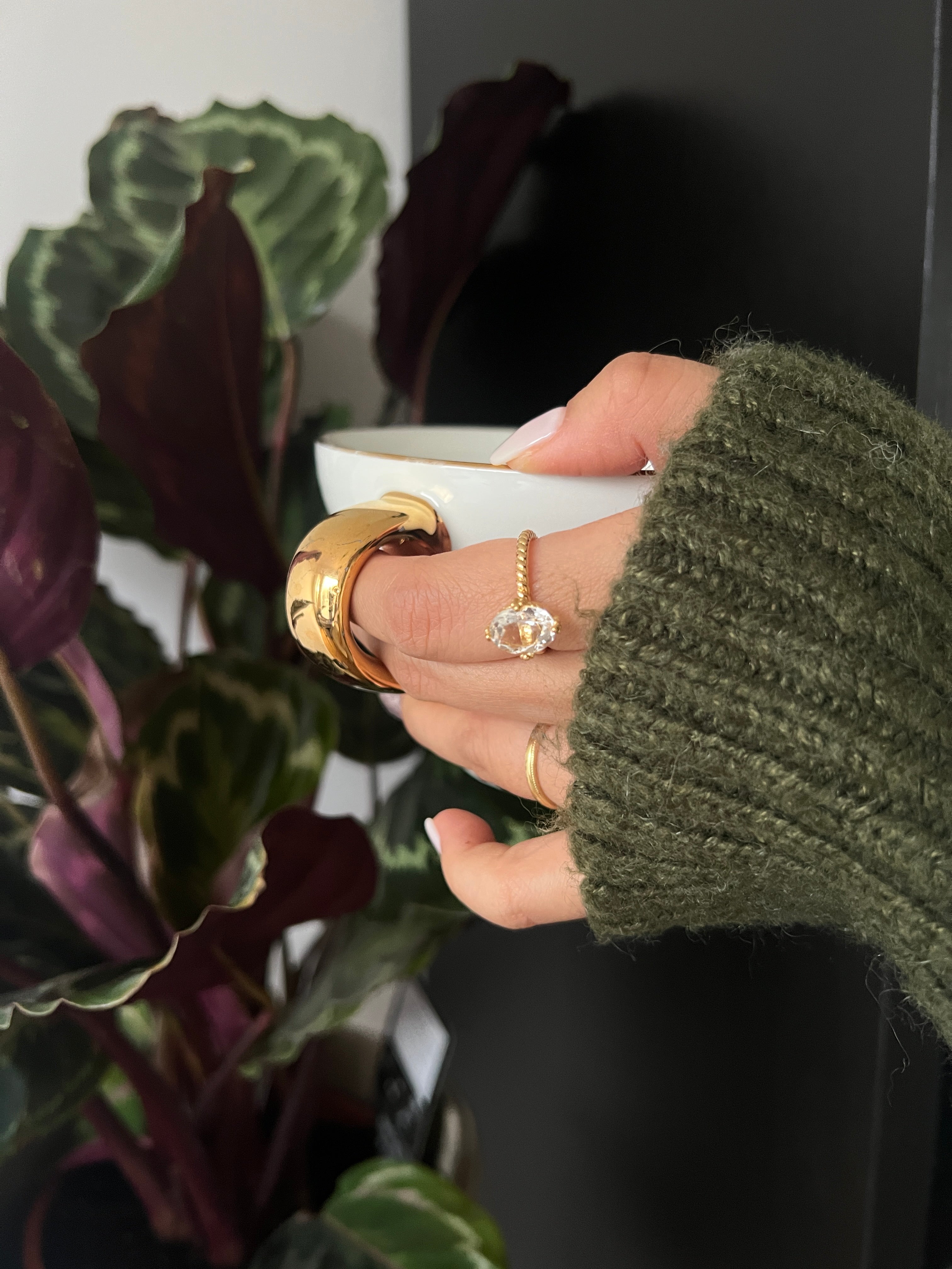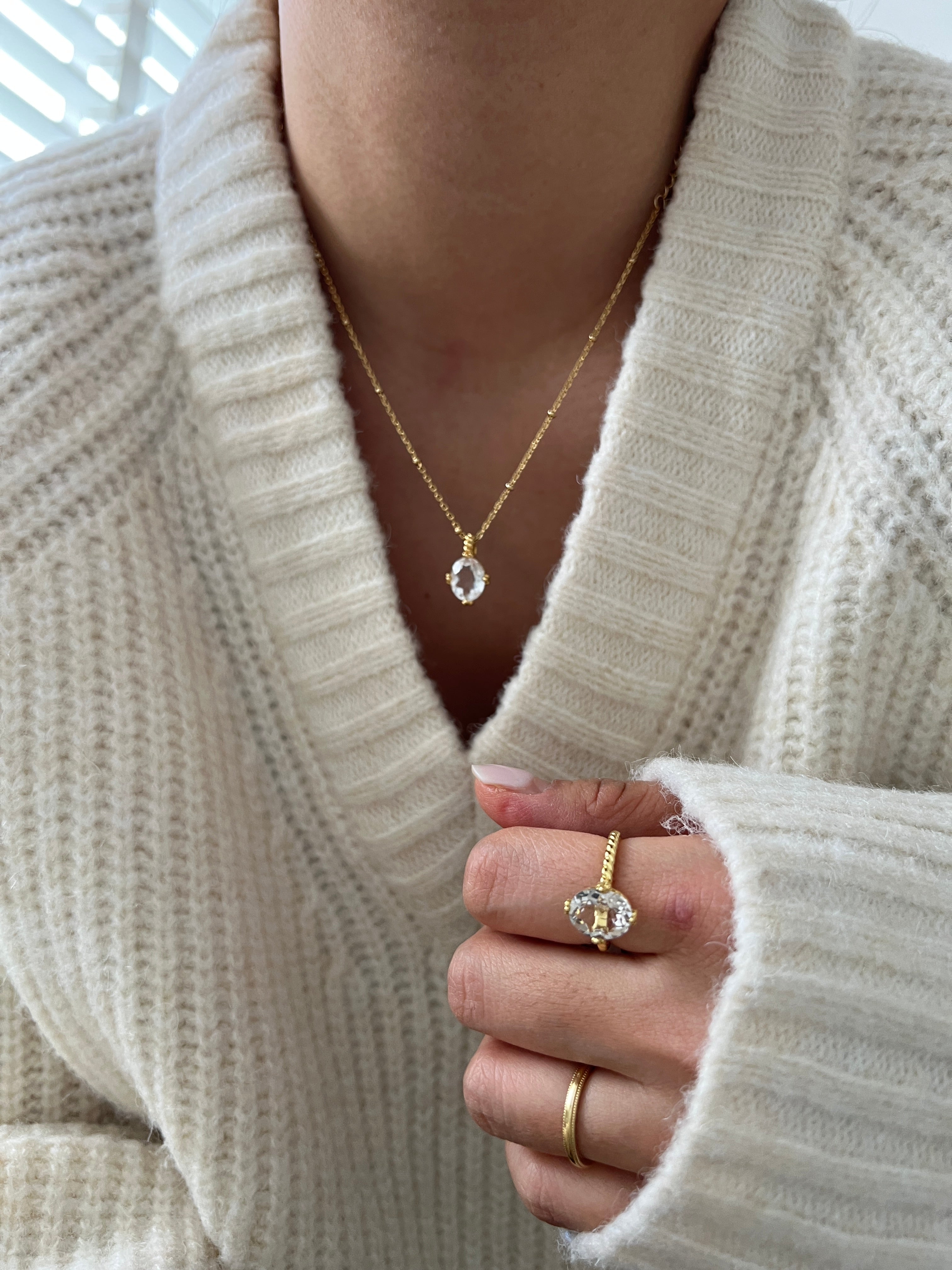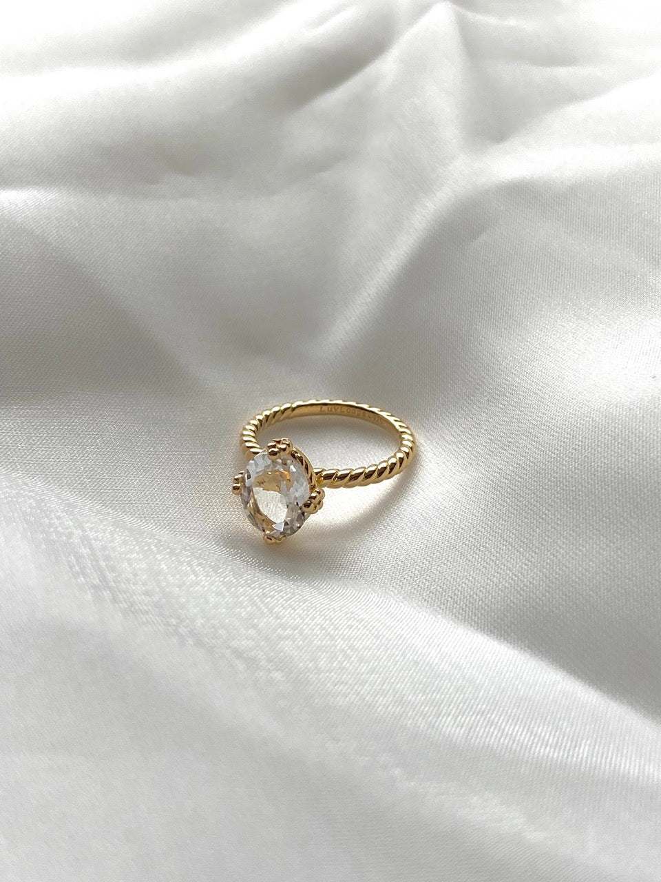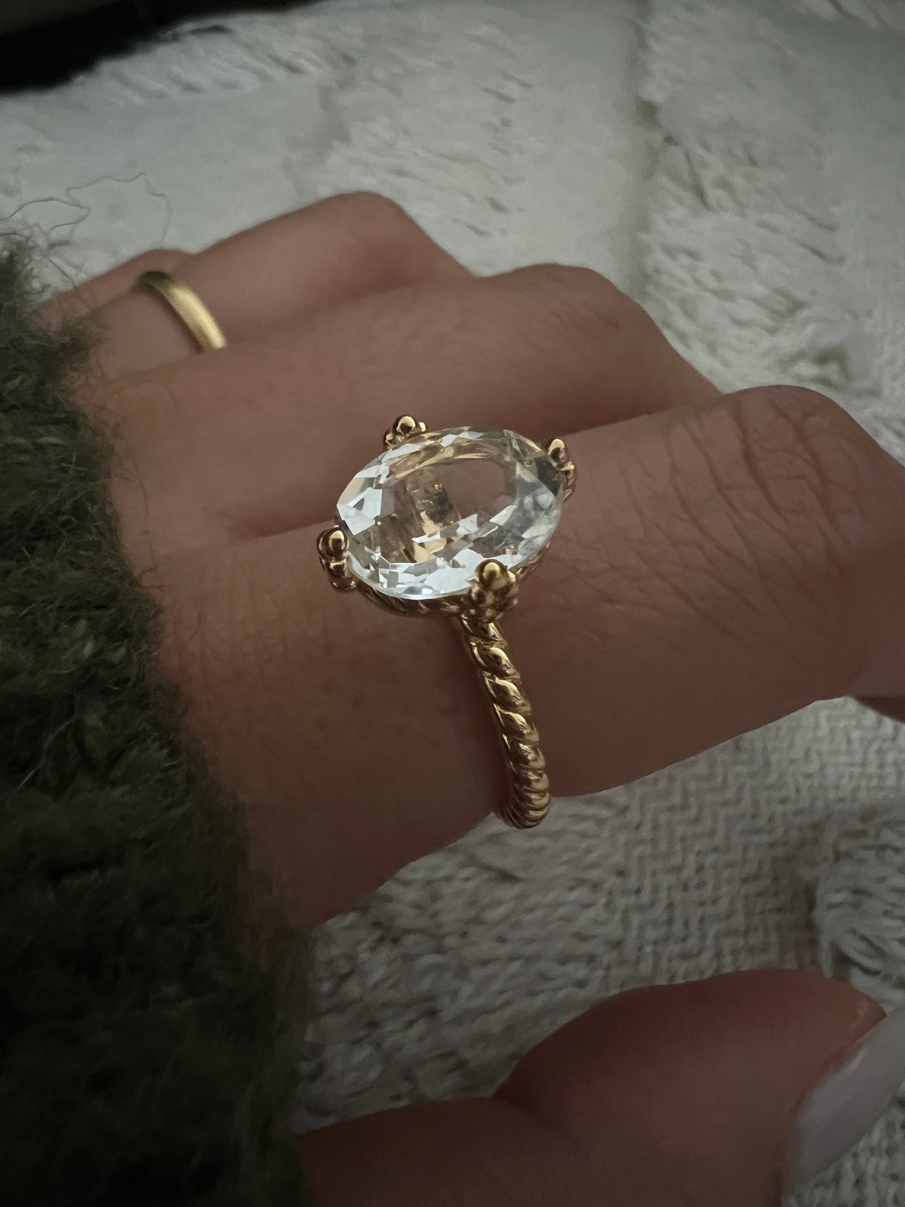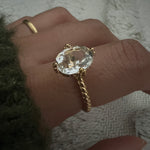 The Siren Crystal Quartz Ring features a breathtaking 2.5-carat oval-cut crystal quartz, symbolizing clarity, healing, and inner strength.